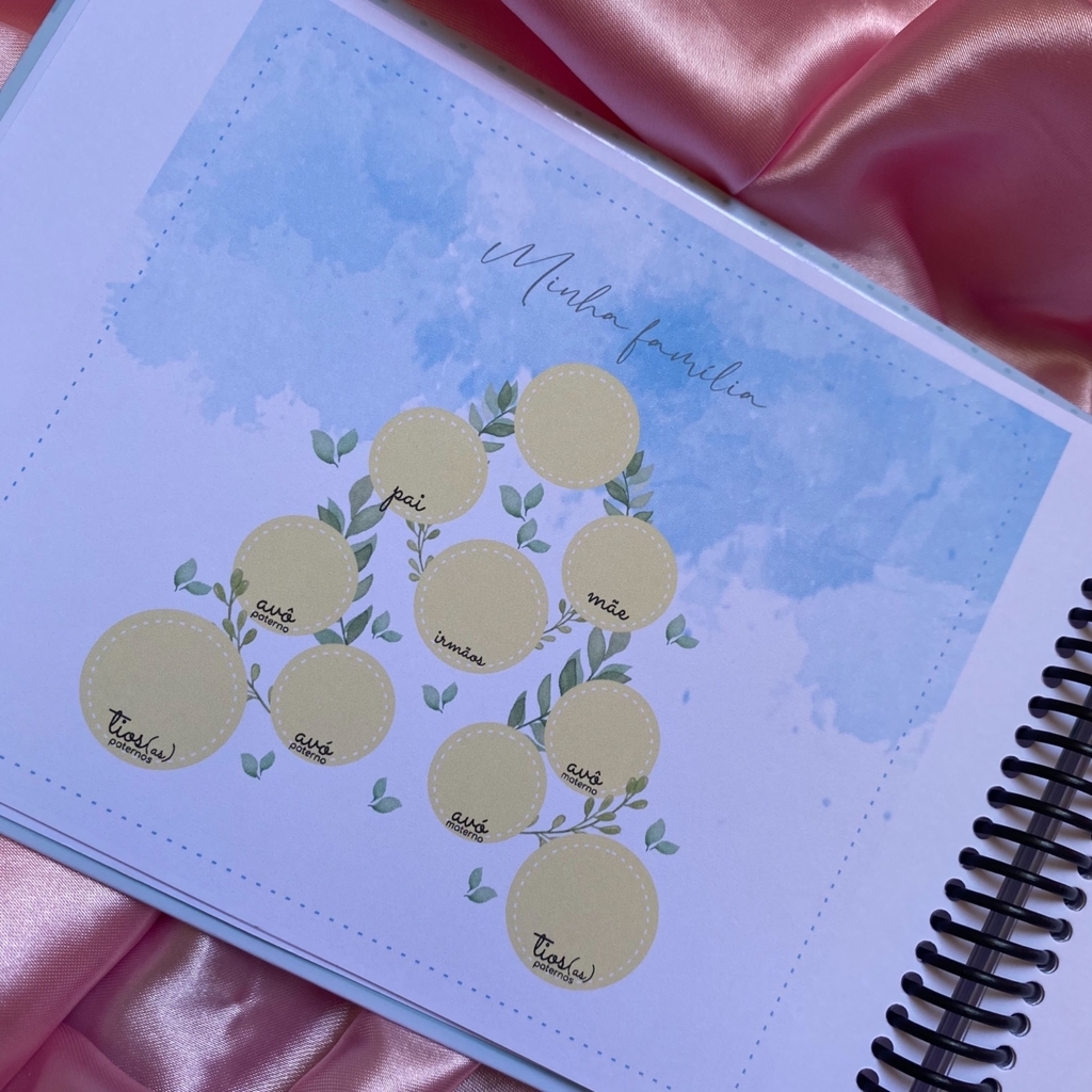 Folhas de anotações, apresentação familiar, arvore genealógica, detalhes da gravidez, foto de gravidez e nascimento, folhas para foto de mesversário, folhas para foto de 1 ao 5 ano.